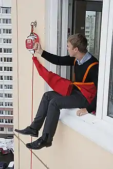 УКСП (устройство канатно-спускное пожарное) - спасательная система, состоящая из каната и тормозного устройства. Предназначена для эвакуации людей и самоспасания пожарных с высотных уровней сооружений, а также решения оперативно-тактических задач при тушении пожаров и проведении аварийно-спасательных работ. Подразделяются на автоматические (с автоматическим поддержанием скорости спуска) и ручные, в которых скорость спуска регулируется самими спускающимися или пожарным-спасателем.[1] Может быть смонтировано как при строительстве здания, так и позднее.