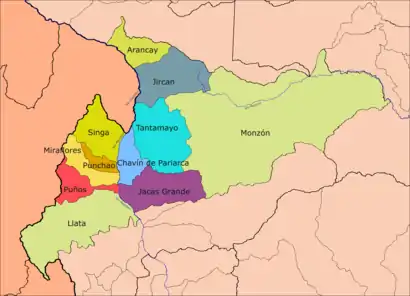 Первые пять округов расположены на западном берегу реки Мараньон, пять предпоследних — на восточном берегу упомянутой реки, а последний район, который является джунглями, расположен на обоих берегах реки Монзон.
