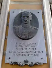 Осенью 1991 года у входа в бывшую гостиницу «Королёвские номера» была установлена первая мемориальная доска в память о проживании в этой гостинице Михаила Александровича. Эта мемориальная доска была спустя несколько лет кем-то уничтожена и впоследствии заменена на новую, а в 1998 году доска была пополнена барельефом великого князя[49][50].