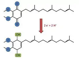Восстановление убихинона до убихинола происходит в комплексах I и II цепи переноса электрона. Цитохром-bc1-комплекс окисляет убихинол до убихинона, а НАДН-дегидрогеназный комплекс осуществляет обратную реакцию. Когда убихинол связывается с цитохром-bc-комплексом, pKa фенольной группы уменьшается настолько, что протон ионизируется и образуется фенолят-анион[8][9][10].