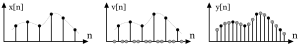 - Отфильтруем полученную последовательность с помощью хорошего низкочастотного фильтра. Фильтр теоретически должен быть sinc-фильтром (идеальный фильтр) с частотой подавления .