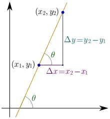 Углово́й коэффицие́нт прямо́й (также накло́н) — коэффициент в уравнении прямой на координатной плоскости, численно равен тангенсу угла (составляющего наименьший поворот от оси Ox к оси Оу) между положительным направлением оси абсцисс и данной прямой.[1]