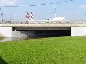 Мост однопролётный железобетонный, балочно-разрезной системы. Пролётное строение состоит из железобетонных балок постоянной высоты. Устои из монолитного железобетона на свайном основании. Общая длина моста составляет 38 м, ширина моста — 26,3 м[2].