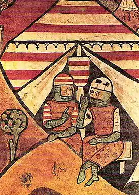 ![]() Уго IV, граф Ампурьяса, и Перо Мака во время завоевания Мальорки. Иллюстрация из «Pintures murals de la conquesta de Mallorca» (1285—1290) | |