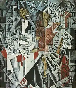 В 1913 г. Удальцова вернулась в Москву и работала в мастерской Татлина. В 1914 г. впервые экспонировала одну из своих кубистических композиций на выставке общества «Бубновый валет»[9], а весной 1915 г. в Петрограде участвовала в 1-й футуристической выставке картин «Трамвай В»: в числе 8 её картин[10] одно из наиболее значительных произведений этого периода — «Ресторан» (1915), навеянное парижскими воспоминаниями и передающее таинственную, полную суеты, жизнь ночного ресторана. Композиция картины «до предела насыщена изображениями дробящихся и пульсирующих граней трансформированных предметов, которые создают иллюзию их движения в пространстве»[11].