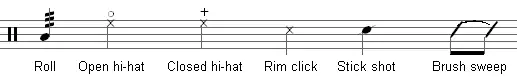 - Rim click — удар по ободу малого барабана обратным концом палочки (другие названия — side stick).