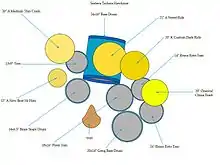 Стандартные размеры рок-установки таковы: 22" × 18" бас барабан, 12" × 9", 13" × 10" навесные томы, 16" × 16" напольный том и 14" × 5.5" малый барабан. Другая распространенная комбинация «фьюжн». Она включает 20" × 16" бас барабан, 10" × 8", 12" × 9" навесные томы, 14" × 14" напольный том и 14" × 5,5" малый барабан. В ударных установках для джаза часто отсутствует второй навесной том.