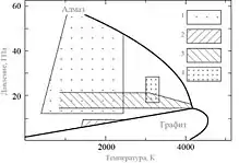 Давление в сотни тысяч атмосфер и температура до нескольких тысяч градусов, характеризующие детонационный процесс, соответствуют области термодинамической устойчивости алмазной фазы на p–T-диаграмме возможных состояний углерода. Вместе с тем в детонационном синтезе при малом времени существования высоких давлений и температур, необходимых для образования алмаза, важная роль принадлежит кинетике образования и роста зародышей алмазной фазы. Обычно для получения алмазных нанопорошков используют смеси тринитротолуола и гексогена в весовом соотношении 1 : 1 или 3 : 2. Для таких смесей давление и температура в детонационной волне составляют p > 15 ГПа и T > 3000 К. При «сухом» детонационном синтезе процесс проводят в специальных взрывных камерах, заполненных инертным или углекислым газом, которые предотвращают окисление образовавшихся алмазных частиц и их превращение в графит. Образование наночастиц алмаза происходит за 0,2–0,5 мкс, так как в детонационном синтезе при весьма малом времени образования алмазных частиц скорость их роста на несколько порядков выше таковой для статических условий. После взрыва конденсированные продукты синтеза собирают и обрабатывают в горячих минеральных кислотах под давлением для удаления сажи и других примесей, многократно промывают в воде и сушат. Выход алмазного порошка составляет 8–9% от исходной массы взрывчатых веществ. Характерной особенностью алмазных нанопорошков, получаемых детонационным синтезом, является чрезвычайно малая дисперсия размеров наночастиц — основная доля частиц имеет размер 4–5 нм.