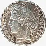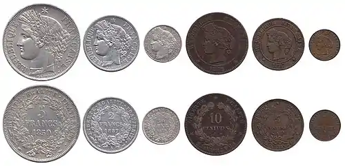 Франция. Монеты Второй и Третьей республики. 5, 2 франка; 50,10, 5 и 1 сантим. На аверсе изображение древнегреческой богини плодородия Цереры работы Эжена-Андре Удине. Серебро, бронза.