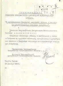 27 декабря 1934 года Политбюро ЦК ВКП (б) рассмотрело вопрос «О преобразовании автономной Удмуртской области в автономную Удмуртскую республику»[2] и приняло решение "немедленно провести это преобразование через ВЦИК. 28 декабря 1934 года постановлением ВЦИК существовавшая с незначительными территориальными изменениями с 1920 года Удмуртская автономная область была преобразована в Удмуртскую АССР[3][4][5]. 20 марта 1935 года ВЦИК узаконил вхождение УАССР в состав Кировского края[5], однако с принятием новой конституции СССР в следующем году краевое деление было ликвидировано.