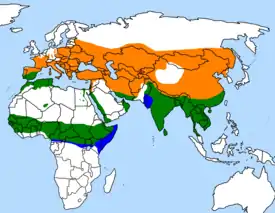 ![]() Места гнездовий Круглогодично Миграции |