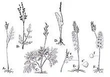 Органы размножения ужовниковых. Гроздовник полулунный (вверху), Ужовник обыкновенный (внизу) |