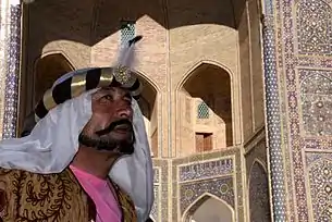 | Мирза Абдулхак и Рустам–бег, узбеки рода катаган. На переговорах в 1841 г, Афганистан. | Узбеки Хивы, Хорезмский оазис, Северо-Северо-Западный Узбекистан, 1913 г. | Узбек на фестивале шёлка и специй в Бухаре. |