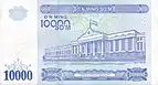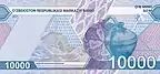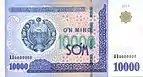 10 000 | светло-синий | лицевая сторона — номинал, государственный герб, название банка-эмитента, оборотная сторона — здание Сената Узбекистана в Ташкенте |