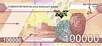 15 января 2019 года Кенгаш Сената Олий Мажлиса утвердил образец и дизайн банкноты номиналом 100 000 сум[9], банкнота выпущена в обращение 25 февраля 2019 года[10].