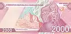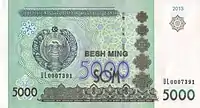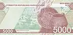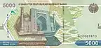 5000 | зелёный | лицевая сторона — номинал, государственный герб, название банка-эмитента, оборотная сторона — здание Парламента Узбекистана в Ташкенте |