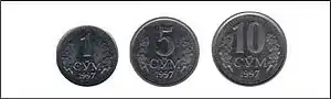 Монеты в 50 сумов 2001 года и 100 сумов 2004 года, хотя и выпущены в честь определённых событий (соответственно — 10 лет независимости и 10 лет национальной валюте), однако Центральным банком не отнесены к памятным монетам. Монеты номиналом 50 и 100 сумов образца 2001—2004 годов выведены из обращения с 1 июля 2019 года[6][15], номиналом 1, 5 и 10 сумов выведены из обращения с 1 марта 2020 года.