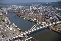 Мост Фримонта через реку Уилламетт, Портленд; за ним — Бродвейский разводной мост, далее — Стальной мост | |