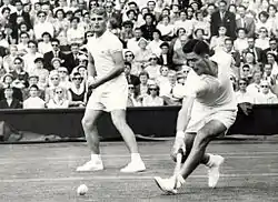 У мужчин в 1946—1955 годах из 21 чемпиона в разных разрядах 18 представляли США и Австралию, тогда как на долю Старого Света, оправлявшегося после войны, пришлось всего три имени: в одиночном разряде побеждали француз Ивон Петра и выступавший под флагом Египта чех Ярослав Дробный, а в смешанных парах чемпионом дважды становился южноафриканец Эрик Стерджесс. Американо-австралийскую гегемонию не могло поколебать даже то, что лучшие игроки у мужчин в послевоенные годы стали массово уходить в профессиональный тур, где уже начали платить солидные по тем временам суммы. В частности, с чемпионом 1956 и 1957 года Лью Хоудом был заключён контракт, по которому он за два года выступлений должен был получить около 45 тысяч фунтов стерлингов, а в 1962 году ещё один двукратный чемпион Род Лейвер получил за переход в профессионалы 50 тысяч. В профессионалы вскоре после своих побед на Уимблдоне перешли также чемпионы 1947, 1953, 1955, 1958 и 1959 годов, финалист 1956 года в одиночном разряде и чемпион 1949 года в мужских парах[41].