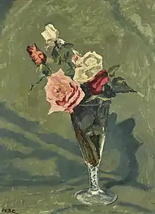 «Этюд роз» (англ. «Study of Roses») или «Розы в стеклянной вазе» (англ. «Roses in a Glass Vase»)[49] был написан в Чартуэлле в 1930-х годах. Приобретая усадьбу в 1922 году, Черчилль полностью перестроил дом и обустроил территорию вокруг него, сам спроектировав большую часть садов и водных сооружений. Позже он проводил много времени, ухаживая за садом, прокладывая собственноручно сетку кирпичных стен и сидя за мольбертом. Супруга политика Клементина Черчилль настаивала, чтобы свежие цветы постоянно были в каждой комнате. Находясь в помещениях дома из-за ненастной погоды, Уинстон черпал вдохновение из цветов, собранных членами семьи и слугами: настурций, тюльпанов, нарциссов. В отличие от масштабных пейзажей, составляющих подавляющее большинство его произведений, натюрморты художника-любителя более интимны и изображают обычно красоту цветов, которые он сам посадил вокруг своего дома. Наибольшее влияние на натюрморты Уинстона Черчилля оказал его близкий друг — художник Уильям Николсон. В «Этюде роз» автор, по мнению Дэвида Кумбса, уловил разницу в текстуре между блестящей полупрозрачной стеклянной вазой, насыщенными зелёными оттенками драпировки на заднем плане и яркими лепестками, которые находятся в вазе[50].