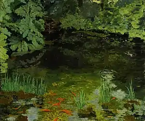 Полотно Черчилля «Пруд с золотыми рыбками в Чартуэлле» (англ. «The Goldfish Pool At Chartwell», С344 в каталоге Кумбса[45]) написано в 1932 году. Картина выполнена маслом по холсту, её размер — 63,5 х 76,5 см[46][45]. Пруд был частью обширной реконструкции Черчиллем всех водных объектов в Чартуэлле и стал для него любимым местом в усадьбе вплоть до конца жизни[46]. Однажды британский художник Грэхем Сазерленд во время беседы на берегу пруда спросил политика, почему он так привязан к этому водоёму. Черчилль ответил, что он может видеть лицо своей умершей дочери Мэриголд, отражённое в его водах. Девочка умерла в 1921 году в возрасте двух с половиной лет во время эпидемии испанского гриппа, последовавшей за Первой мировой войной. Её похоронили не на семейном участке в церкви Святого Мартина в Блейдоне (Оксфорд), а на кладбище Кенсал-Грин в Лондоне[47]. Вячеслав Шестаков называл «Пруд с золотыми рыбками в Чартуэлле» одним из наиболее удачных его произведений с «водными рефлексами»[48].