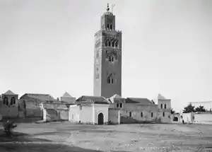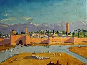 В январе 1943 года в Касабланке в Марокко состоялась конференция «Большой двойки», продолжавшаяся десять дней. Когда все вопросы были решены[Прим 5], Рузвельт собирался возвращаться в США, но Черчилль предложил посетить Марракеш. Президент согласился. Путешествие заняло четыре часа. Политиков сопровождали около тридцати помощников и охранников, вооружённых автоматами, в небе над ними летали военные самолёты. Черчилль и Рузвельт остановились в доме американского вице-консула за пределами Марракеша, к дому примыкала выстроенная в традиционном стиле башня, с которой открывался вид на город. Рузвельт и Черчилль забрались туда по винтовой лестнице, чтобы увидеть закат солнца на фоне покрытых снегом Атласских гор. На следующий день президент уехал, а Черчилль вновь поднялся на башню и несколько часов рассматривал панораму города, а потом приступил к работе над полотном. На нём изображена сверху и сбоку панорама Марракеша с минаретом мечети Аль-Кутубия на фоне горной гряды. Художнику, по мнению Вячеслава Шестакова, удался колорит картины, «в которой доминирует солнечный цвет, контрастирующий с фиолетовыми горами и с голубоватой дымкой неба». Российский искусствовед, не считавший её шедевром, воспринимал картину как «мечту, утопию мирной жизни и вечной красоты природы»[57]. Черчилль работал над картиной два дня, чередуя работу над ней с перепиской с военным министерством[55].