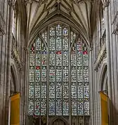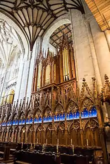 Эта преграда была в свою очередь разобрана в 1870-х годах и заменена деревянной по проекту сэра Джорджа Гилберта Скотта[33], который вдохновлялся балдахинами на мизерикордиях[34]. Эту работу сильно критиковали, хотя она в улучшенном виде воспроизводит обращённые к востоку мизерикордии начала XIV века, обратной стороной которых она является. Статуи Стюартов переместили к западному концу нефа в ниши по обе стороны двери. Также Скотт переместил аналой к северной стороне хоров близ кафедры, обратив его лицом на запад, и в таком положении аналой оставался столетие, после чего его переставили посередине, обратив к востоку.