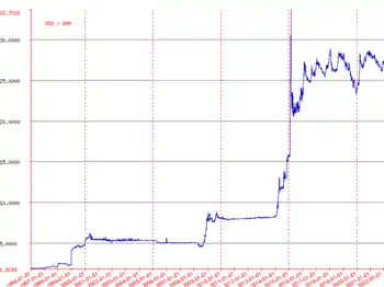 Курс НБУ на момент ввода в обращение гривны составлял 1,76 гривны за Доллар США[51] (то есть 176 000 купонов). В дальнейшем, примерно в течение двух лет после введения курс гривны к доллару держался на уровне 2 грн. за доллар. После начала российского финансового кризиса в августе 1998 года НБУ перешёл к жесткому администрированию валютного рынка и старался лавировать на рынке государственных облигаций, чтобы не допустить панического оттока инвестиций[52]. В сентябре 1998 года курс резко упал до 3,42 грн. за доллар и постепенно падал в следующем году. В начале февраля 2000 года курс достиг уровня 5,60 и гривна начала постепенно понемногу укрепляться. С апреля 2005 руководство Нацбанка Украины 3 года поддерживало фиксированный официальный курс 5,05 грн. за доллар.