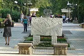 - «Краеугольный камень», скульптор — Владимир Бабак, скульптура представляет собой металлическую пирамиду, на которой стоит камень.