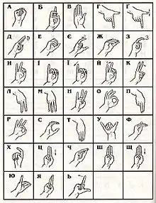 Следует отметить, что дактилемы русской и украинской дактильной азбуки совпадают (естественно, речь идет о буквах, общих для обоих алфавитов).