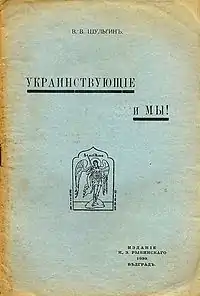 Эмигрант и политический деятель русского национального и монархического направления Василий Шульгин в статье, а затем и отдельной брошюре «Украинствующие и мы», изданной в 1939 году в Белграде, выступил с резкой критикой украинства, которое назвал «сектантством» и политическим заблуждением. Также он изложил теорию с классификацией украинствующих на три типа: честные и незнающие (те, кого обманывают), нечестные и знающие (те, кто обманывают), и честные и знающие (маньяки раскола)[36][37].