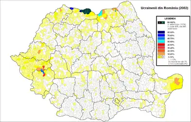 По результатам переписи 2002 года в Румынии численность украинцев составляет 61 091 человек. В коммунах с преобладанием украинского населения в 2002 году проживало 54,5 % украинцев Румынии[8][9]: