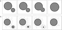 При коалесценции два отдельных островка, сливаясь, образуют один островок, как это схематически показано на рисунке. Если островки подвижные, то они при своем движении могут сталкиваться друг с другом и коалесцировать. Этот процесс называют динамической коалесценцией или созреванием Смолуховского (Smoluchowski ripening) по имени польского физика М. Смолуховского, который в 1916 году сформулировал кинетическую теорию укрупнения коллоидных частиц по данному механизму. Статическая коалесценция соответствует случаю, когда неподвижные соседние островки коалесцируют за счет увеличения их размера в ходе напыления.