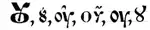 (первая форма буквы — заглавная; вторая и последующие — используются в церковнославянском языке как строчные, где в начало слова зачастую ставится только «оу»); в глаголице по счёту 22-я, имеет вид