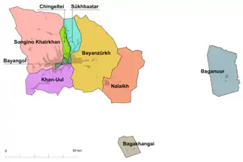 Улан-Батор с окрестностями образует самостоятельную административную единицу (официальное название: «Улсын нийслэл» — «Столица государства»), разделённую на 9 районов (монг. дүүрэг); районы разделены на кварталы-микрорайоны (монг. хороо). Территория, находящаяся под управлением мэрии Улан-Батора, включает в себя, помимо «костяка города», также возникшие после 1990 года новые кварталы застройки, складывающиеся из преимущественно одноэтажных жилых и хозяйственных построек, а также большого количества юрт. Новые районы соединены с центром автобусными линиями и маршрутного такси[83].