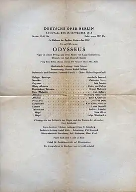Премьера оперы состоялась на немецком языке (в переводе Карла-Хайнриха Крайта) в Немецкой опере в Берлине под управлением Лорина Маазеля (была сделана запись) 29 сентября 1968 года (режиссёр-постановщик Густав Рудольф Зелльнер, сценография и костюмы Фернандо Фарулли). Премьерой сам композитор остался доволен, несмотря на многочисленные трудности, особенно метрического характера, которые пришлось преодолевать исполнителям: Даллапикколе не раз говорилось, что «Улисс» — самая сложная из опер, когда-либо в Берлине ставившихся[7].