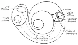 Улитка — это заполненный жидкостью перепончатый канал, образующий два с половиной витка спирали. Внутри по всей длине расположен костный стержень. К противоположной стенке идут две плоские мембраны (основная и рейснерова), таким образом, улитка по всей длине делится на три параллельных канала. Два наружных канала — лестница преддверия и барабанная лестница — сообщаются между собой у верхушки улитки. Центральный (спиральный) канал началом сообщается с мешочком и слепо оканчивается.