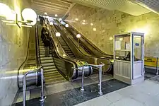 На одном конце в северном подземном вестибюле общая лестница, на другом конце в южном подземном вестибюле — эскалаторы. Станция имеет два подземных вестибюля, выполненных по типовому проекту из стекла, выходящие на Варшавское шоссе, улицы Академика Янгеля и Россошанскую.