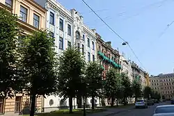 - д. 8. Считается первым зданием инженера-архитектора Эйзенштейна на этой улице. Строительство практически было закончено в 1903 году, тем не менее дом начал функционировать как доходный лишь с 1908 года. Совсем недавно, в начале 2010 года, была завершена реставрация здания. Здание отличает нарядный, богато и симметрично декорированный эркер, пилястры увенчаны женскими маскеронами, аллюзивно отсылающими к мотивам египетской мифологии; неоднократно приходилась слышать разговорное название для этого дома — «саркофаг».