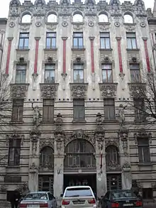 Фасады отличают кричащие женские маскероны, стоячие скульптурные изображения женщин с открытыми ртами с выражением беспокойства и тревоги. Умиротворяющим контрастом на их фоне кажется маскерон бога солнца Аполлона, помещённый в композиционный центр здания. Птица Феникс, опустившая перья хвоста, изображения дев со скрещёнными под бюстом косами, козлиные черепа, геометрическая символика — всё указывает на танатологические и даже эсхатологические ощущения автора проекта. Во многом здание соотносится со стилевым приёмом, принятом в раннем рижском модерне — horror vacui, который после 1905 года быстро вышел из моды.