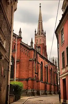 ![]() Вид улицы Англиканю от улицы Пилс, слева - Англиканская церковь | |