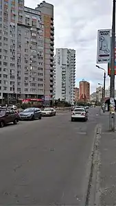 Застройка улицы представлена многоэтажными домами. Угол улицы и проспекта Петра Григорнеко занят строительным гипермаркетом Эпицентр.