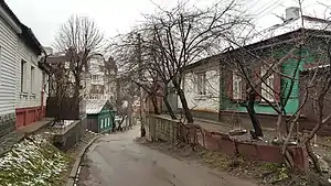 ![]() конец улицы, исторические дома: справа № 45 (зелёного цвета) и слева № 46 (зелёного цвета) | |