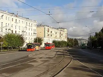 От пересечения с проспектом Хусаина Ямашева на север (в сторону КАПО им С. П. Горбунова) также были пущены трамваи маршрута № 13 (с 1979 года), а на юг в сторону железнодорожного вокзала действовали трамваи маршрута № 14 (1980—2009 годы), встречных кольцевых маршрутов № 20 и № 21 (1999—2008 годы, до ликвидации трамвайной линии в центре Казани) и маршрута № 19 (2008—2009 годы)[24]. В настоящий момент, трамвайные рельсы на пересечении с проспектом Х. Ямашева, пущены под улицей Декабристов (под эстакадой) и проходят по улице Ленская до пересечения с улицей 2-я Юго-Западная, где соединяются с веткой, по которой уже ходит трамвай 9-го маршрута.