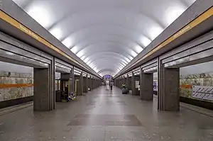 «Улица Дыбенко» — колонно-стеновая станция глубокого заложения (глубина ≈ 61 м). Сооружена по проекту архитекторов О. Г. Кравцова, М. П. Антонова и Г. А. Васильева.