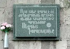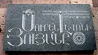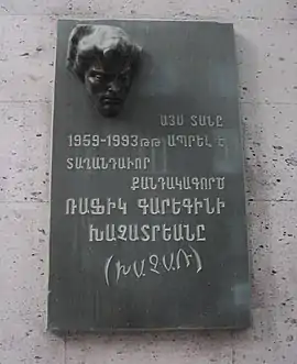 д. 42 — Лусине Закарян (мемориальная доска), Сурен Елян (мемориальная доска), Марат Аладжян (мемориальная доска)