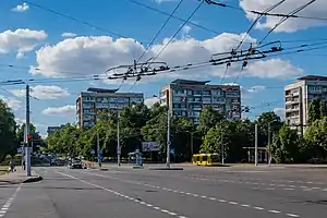 По улице курсируют автобусы, троллейбусы и маршрутные такси.