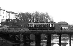 ![]() Трамвай двигается с улицы Бакунинской (сегодня ул. Кирилла и Мефодия) по давнему маршруту конки. Несуществующий ныне Новый мост через Свислочь. Осень 1929 года. | |