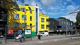 - Kopli tn 16 — выразительный жёлто-чёрный сдвоенный дом, построен в 2018 году. На первом этаже — кафе и ресторан, на втором и третьем — квартиры.