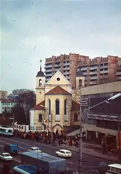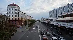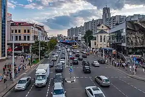 ![]() Вид с путепровода (ул. Ленина — пр. Победителей) на юго-запад. Справа (чётная сторона) видна застройка 1970-х — 1980-х годов, собор Петра и Павла (XVII век), фрагмент горельефа «Солидарность» | |